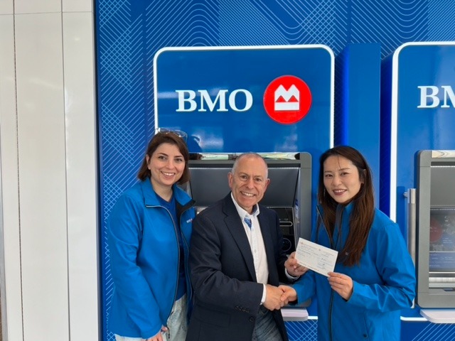 Peter Luongo accepting a cheque from the Langley Rotary Club President Michael Bolu